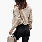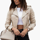 Denne dame læderjakke har en kort, tætsiddende pasform og iøjnefaldende lynlåsdetaljer for et moderne udseende. Den reverskrave og dekorative skulderdetaljer giver designet ekstra karakter. Ideel til at kombinere med både en afslappet og en mere formel outfit til forskellige anledninger